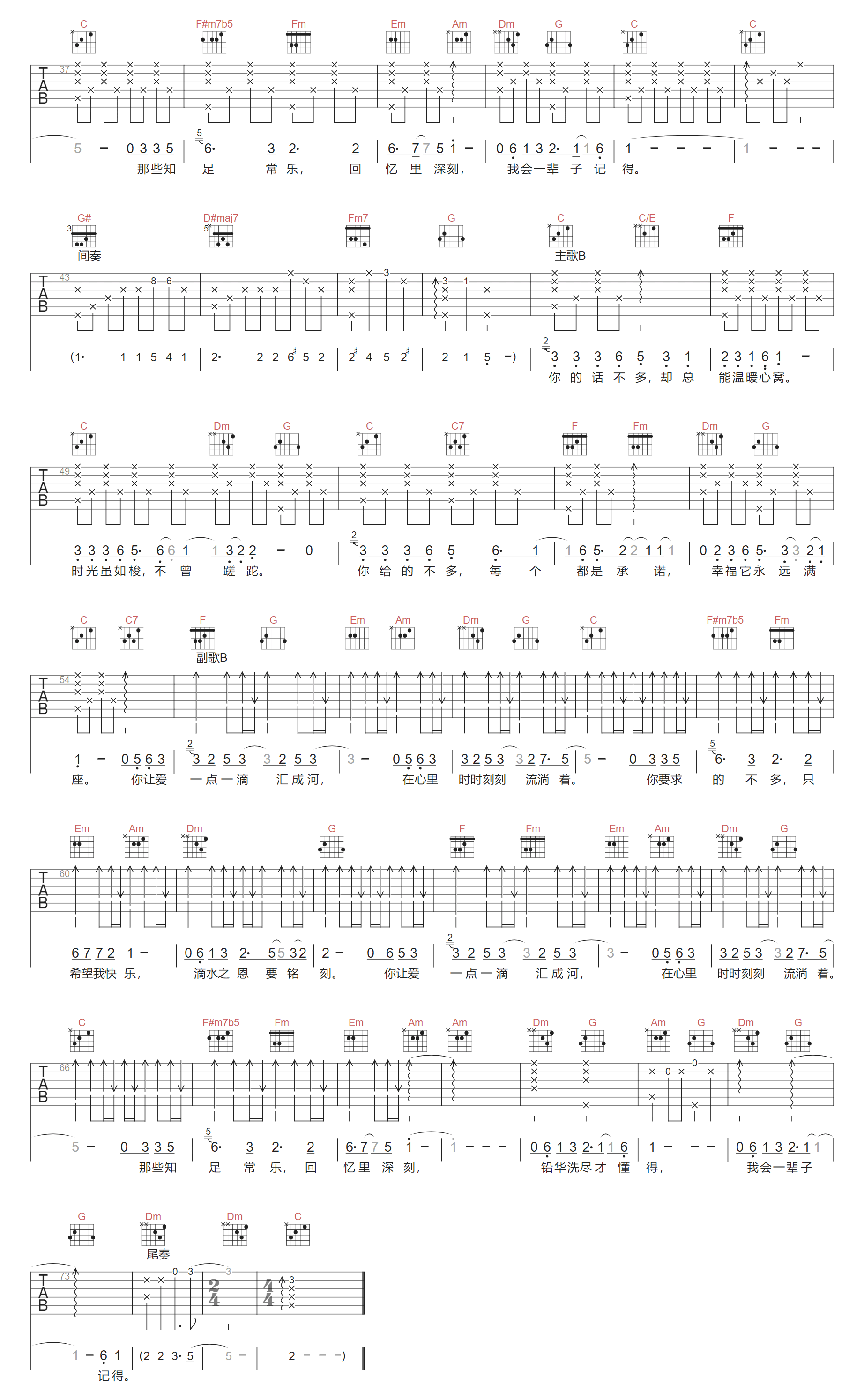 一点一滴吉他谱,歌曲原调为C调,此版本的曲谱来源于@小埋,为4/4拍的节奏,按C调指法编配,共2张高清吉他谱,变调夹不夹为原歌曲的调式,演唱时可按个人音域选择合适的变调夹位置。