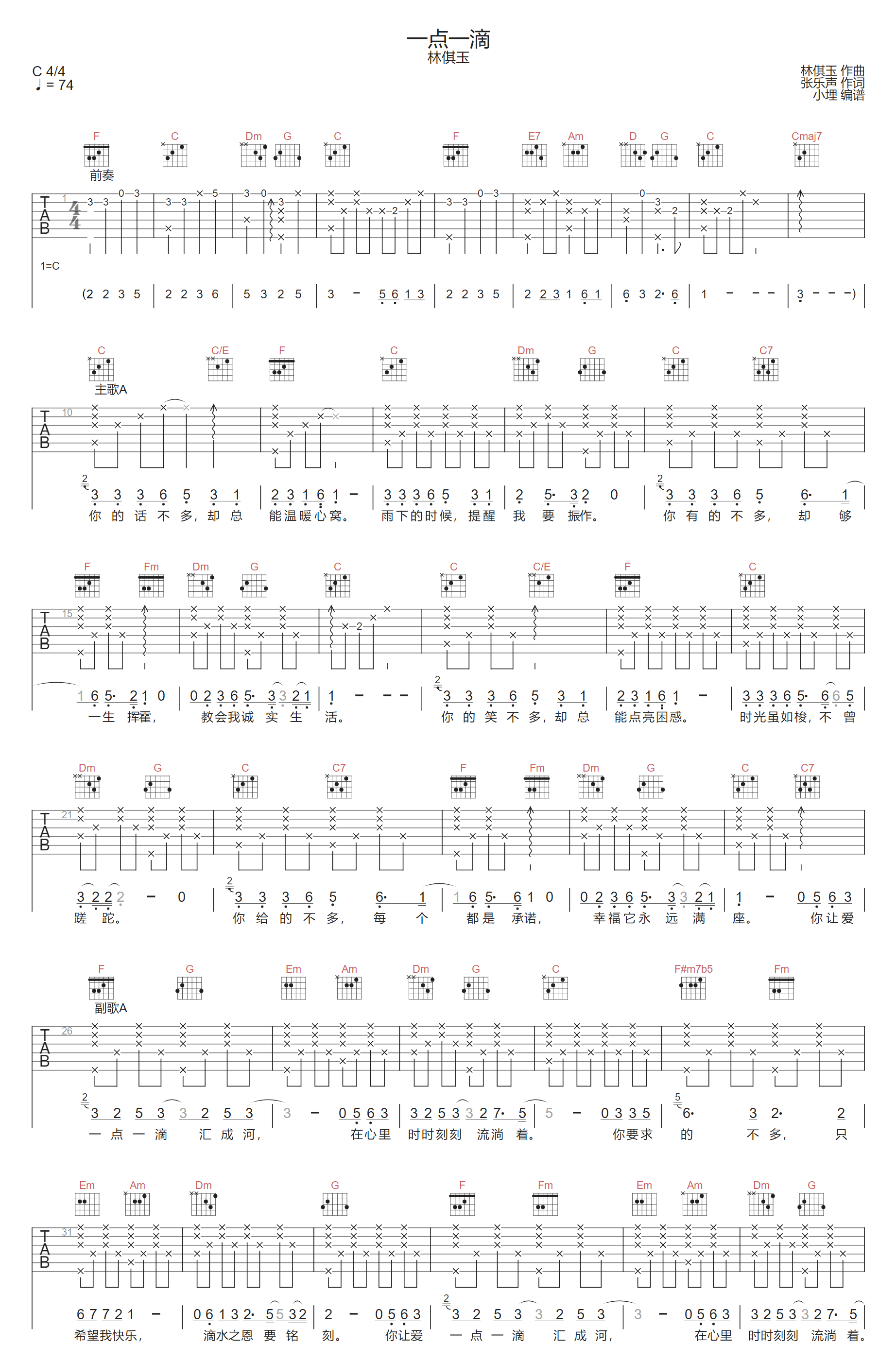 一点一滴吉他谱_林倛玉_C调原版弹唱谱_图片六线谱