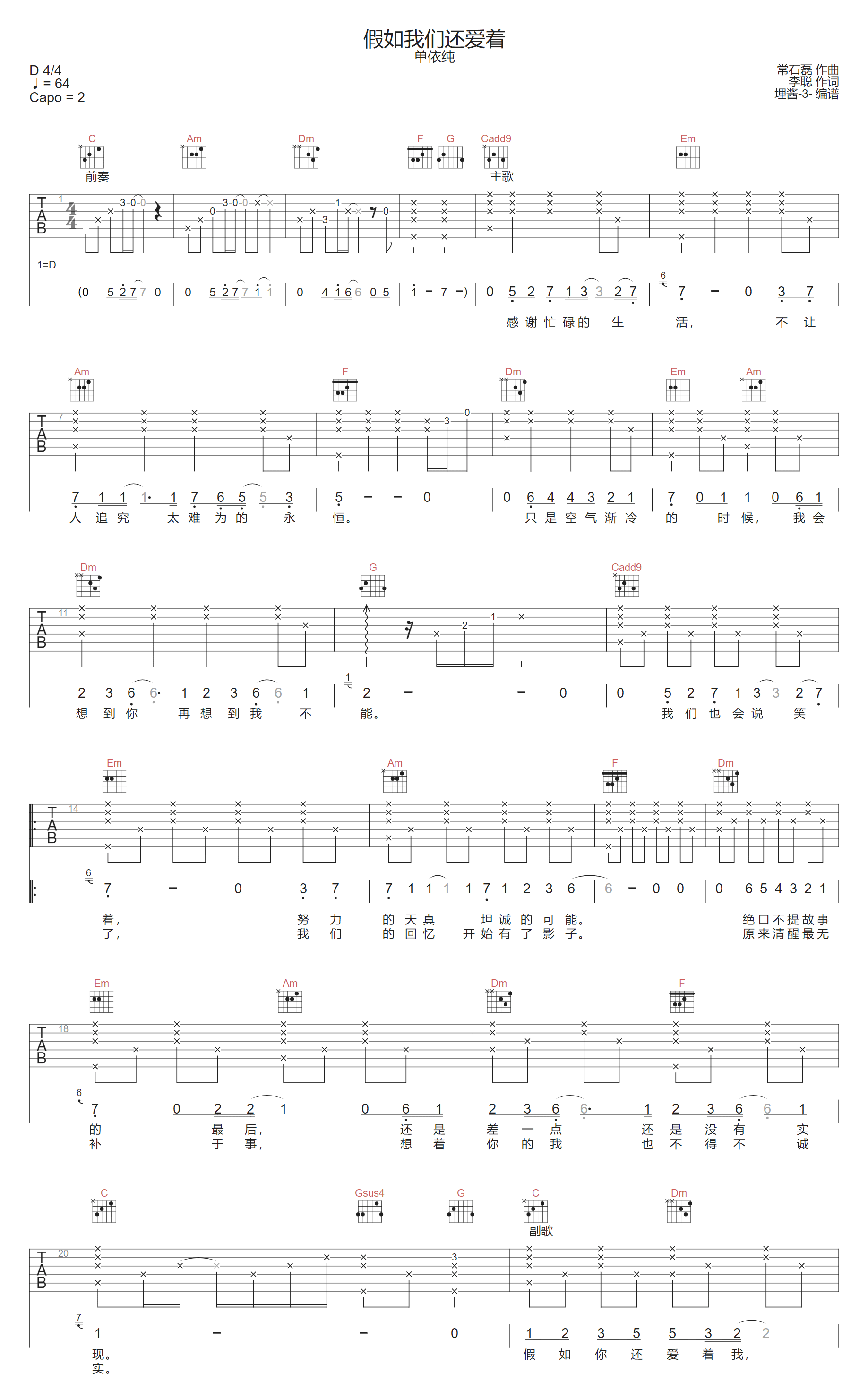 假如我们还爱着吉他谱,歌曲原调为D调,此版本的曲谱来源于@埋酱,为4/4拍的节奏,按C调指法编配,共2张高清吉他谱,变调夹2品为原歌曲的调式,演唱时可按个人音域选择合适的变调夹位置。
