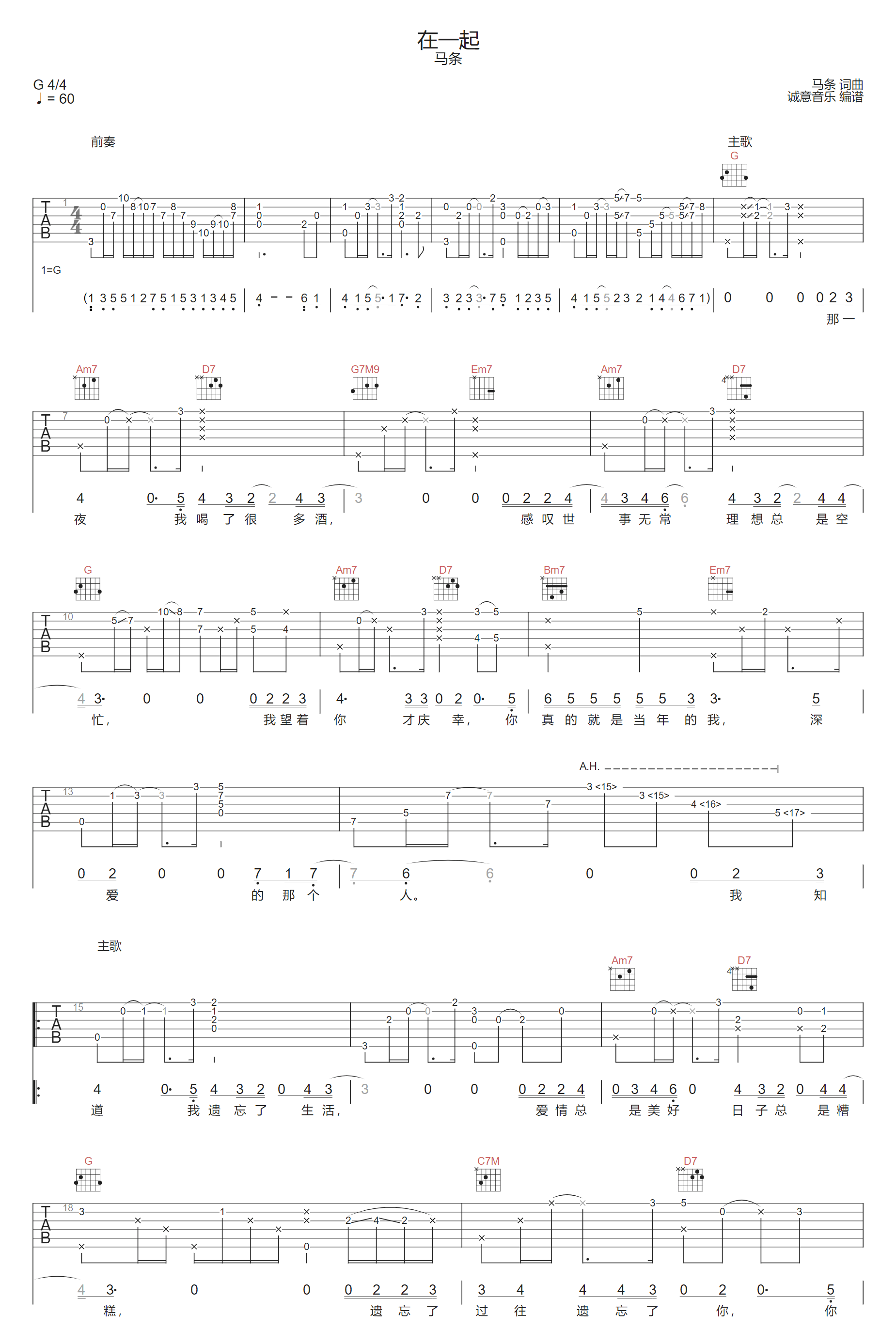 在一起吉他谱_马条_G调原版弹唱谱_图片六线谱