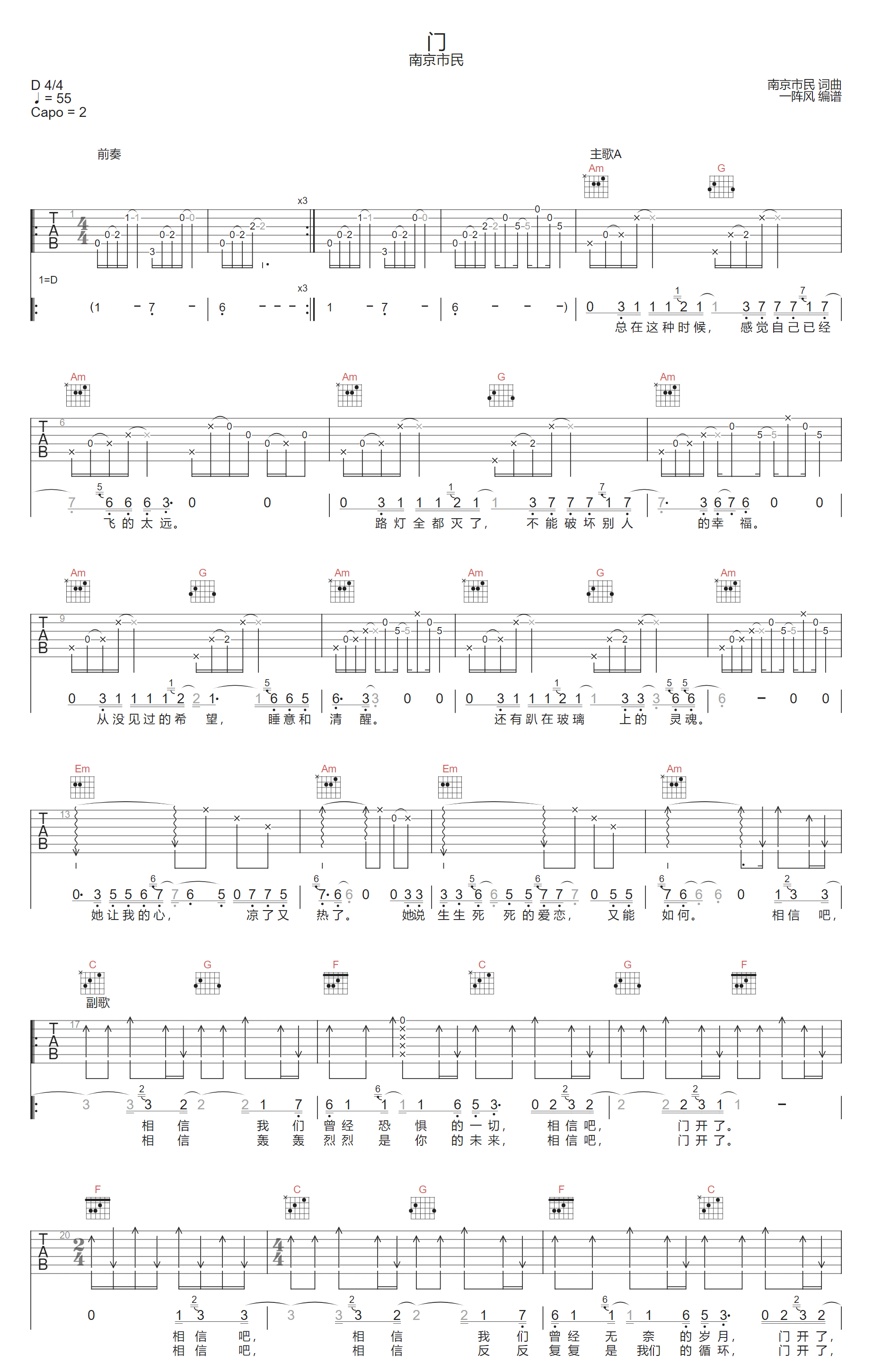 门吉他谱,歌曲原调为D调,此版本的曲谱来源于@一阵风,为4/4拍的节奏,按C调指法编配,共3张高清吉他谱,变调夹2品为原歌曲的调式,演唱时可按个人音域选择合适的变调夹位置。