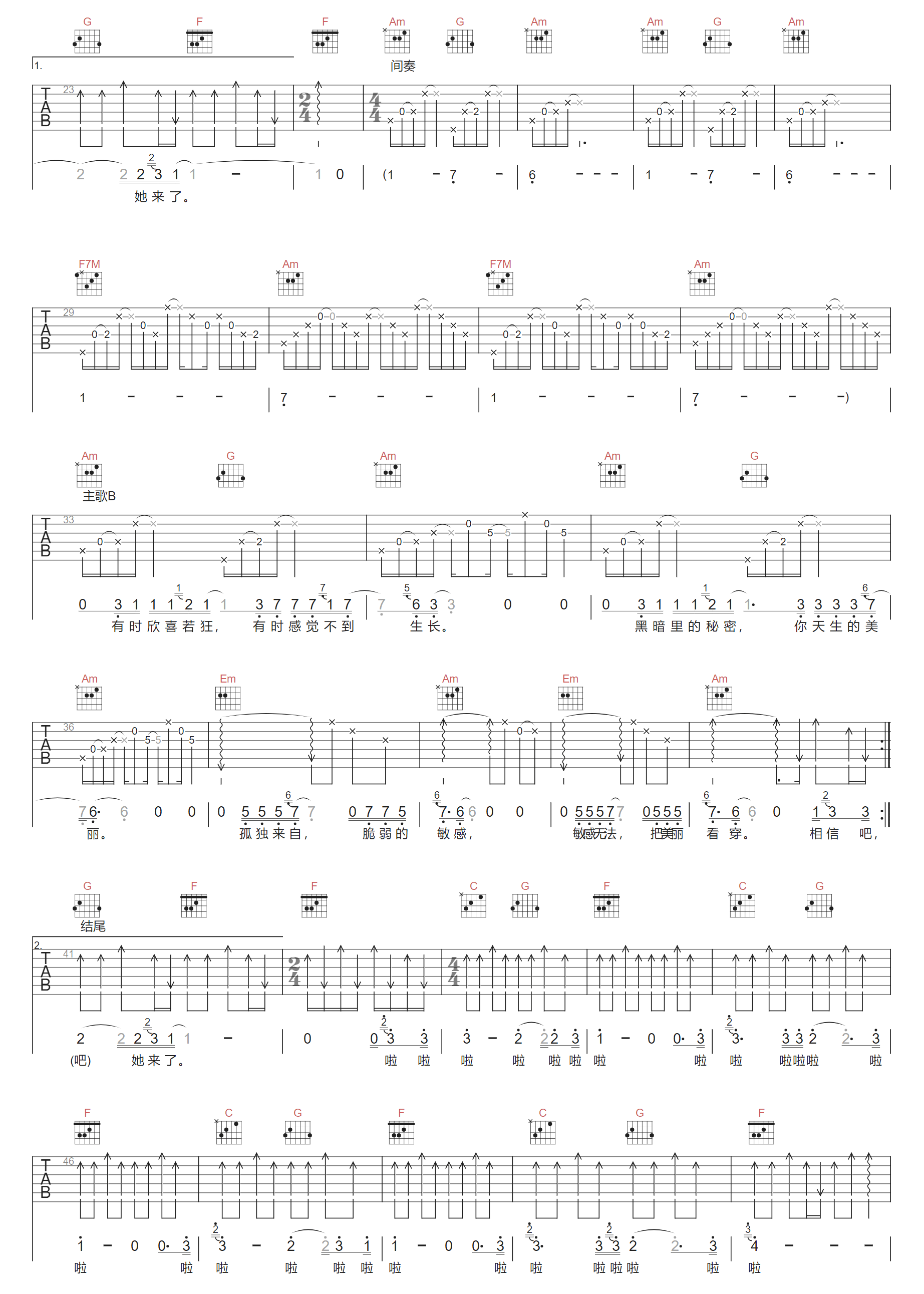 南滨路没有尽头吉他谱,歌曲原调为C调,此版本的曲谱来源于@郑好,为4/4拍的节奏,按C调指法编配,共3张高清吉他谱,变调夹不夹为原歌曲的调式,演唱时可按个人音域选择合适的变调夹位置。 -