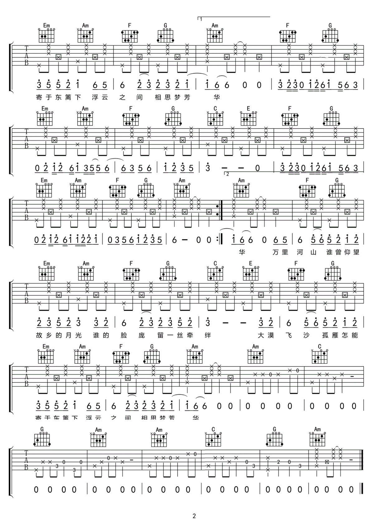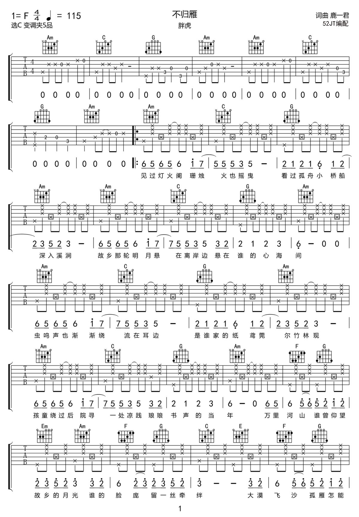 不归雁吉他谱,歌曲原调为F调,此版本的曲谱来源于@52JT,为4/4拍的节奏,按C调指法编配,共2张高清吉他谱,变调夹5品为原歌曲的调式,演唱时可按个人音域选择合适的变调夹位置。