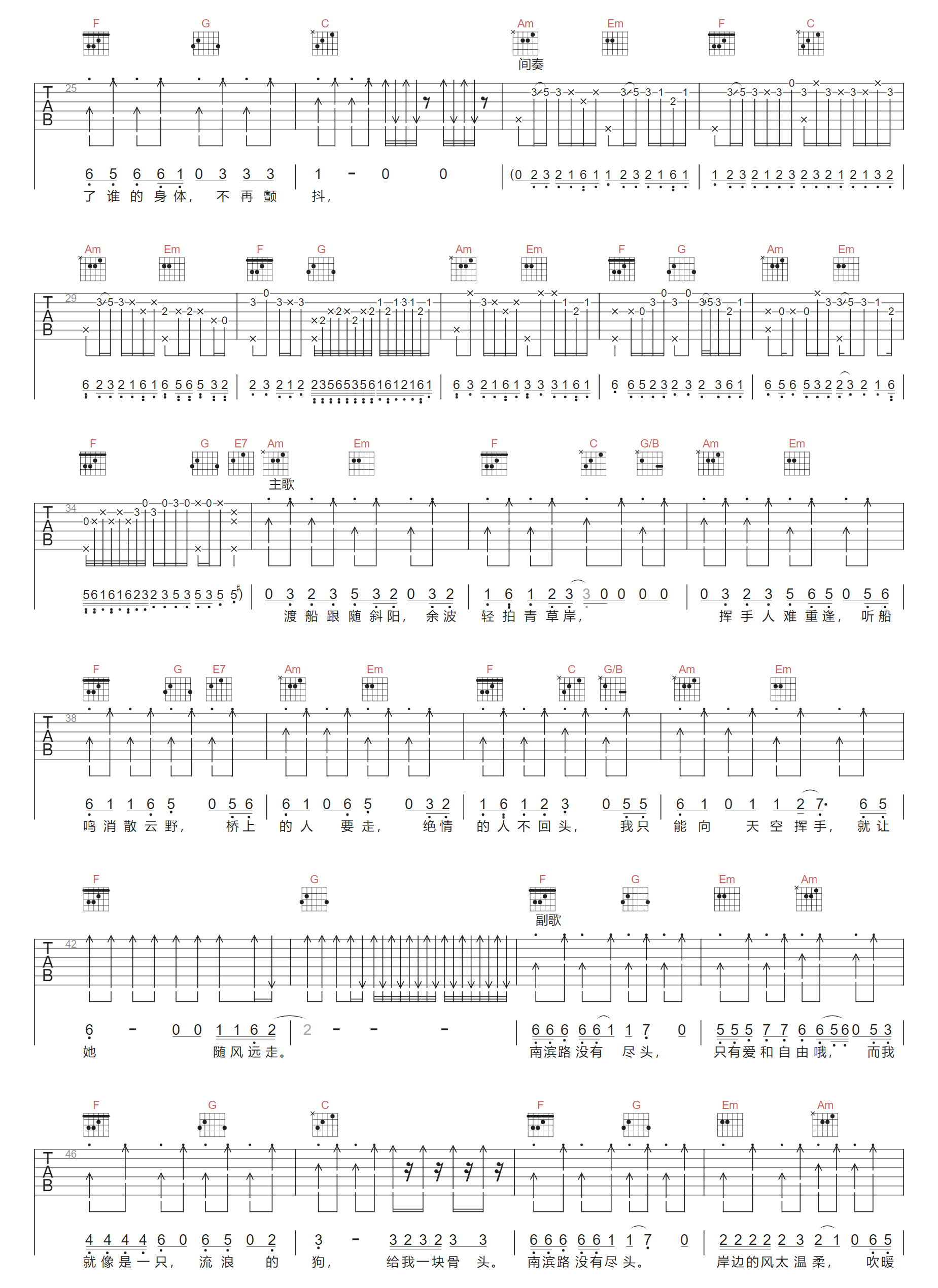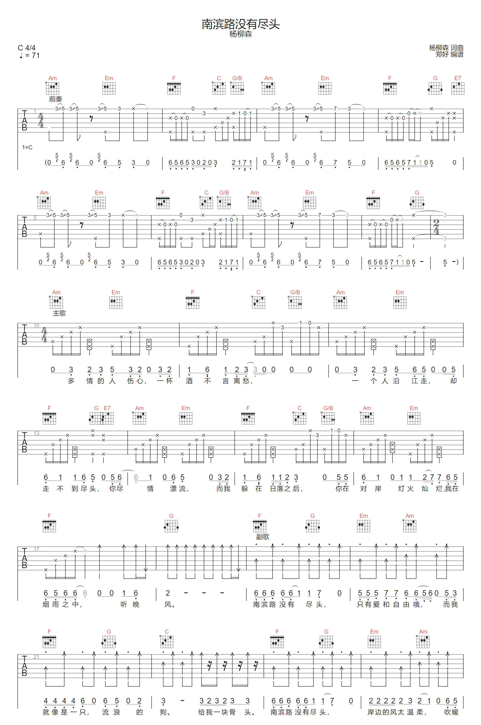 南滨路没有尽头吉他谱,歌曲原调为C调,此版本的曲谱来源于@郑好,为4/4拍的节奏,按C调指法编配,共3张高清吉他谱,变调夹不夹为原歌曲的调式,演唱时可按个人音域选择合适的变调夹位置。