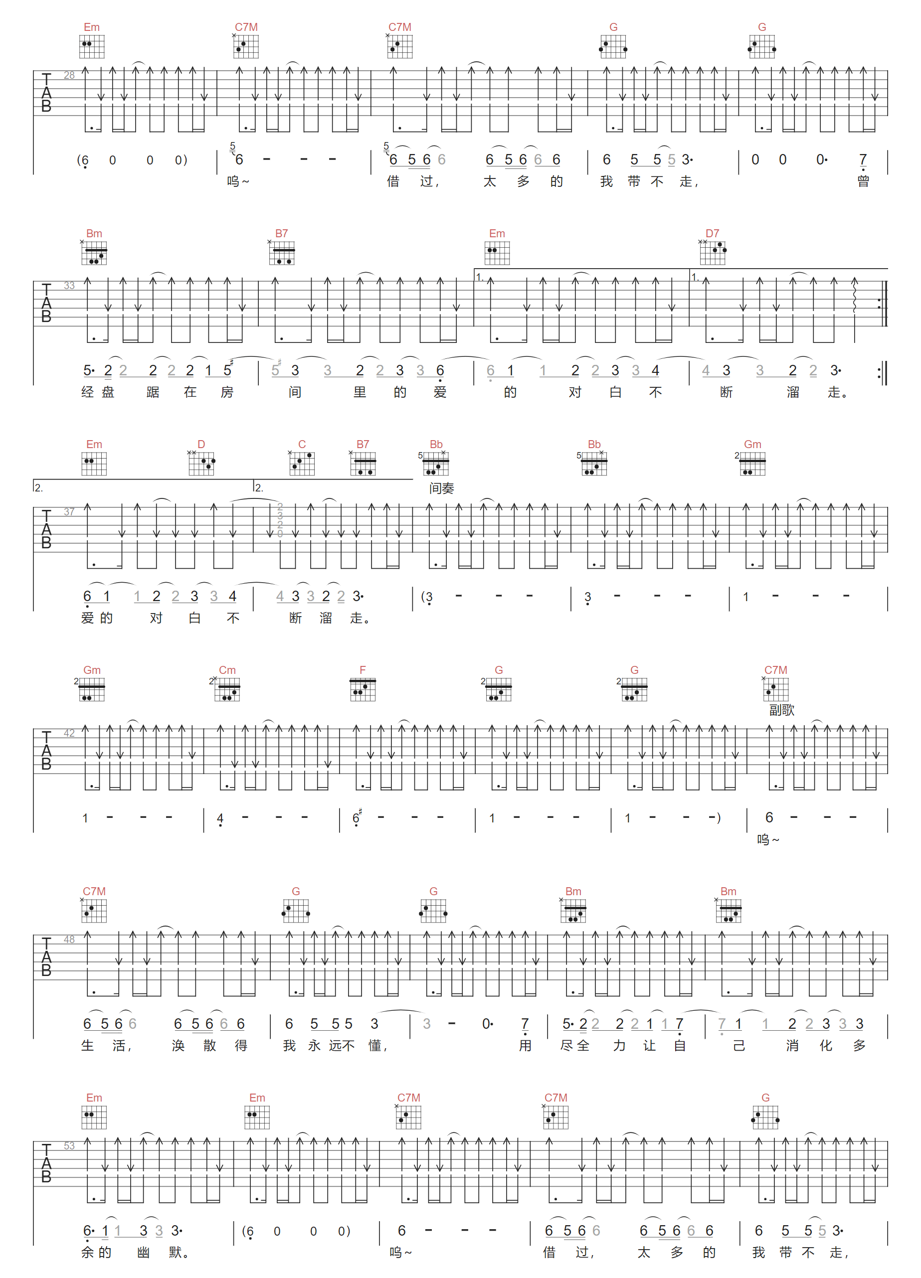 南滨路没有尽头吉他谱,歌曲原调为C调,此版本的曲谱来源于@郑好,为4/4拍的节奏,按C调指法编配,共3张高清吉他谱,变调夹不夹为原歌曲的调式,演唱时可按个人音域选择合适的变调夹位置。 -