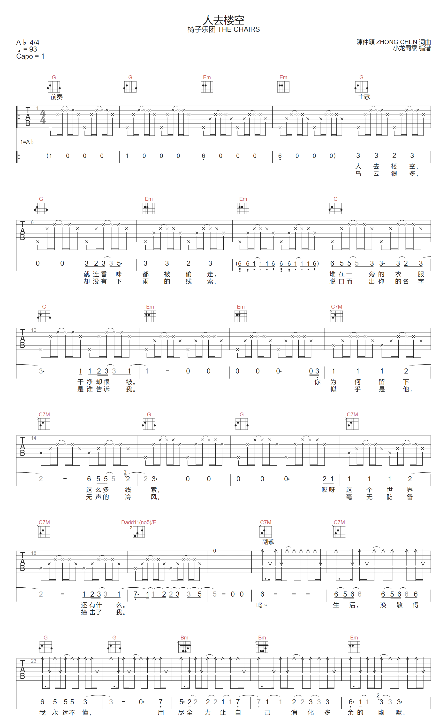 人去楼空吉他谱,歌曲原调为降A调,此版本的曲谱来源于@小龙蜀黍,为4/4拍的节奏,按G调指法编配,共3张高清吉他谱,变调夹1品为原歌曲的调式,演唱时可按个人音域选择合适的变调夹位置。