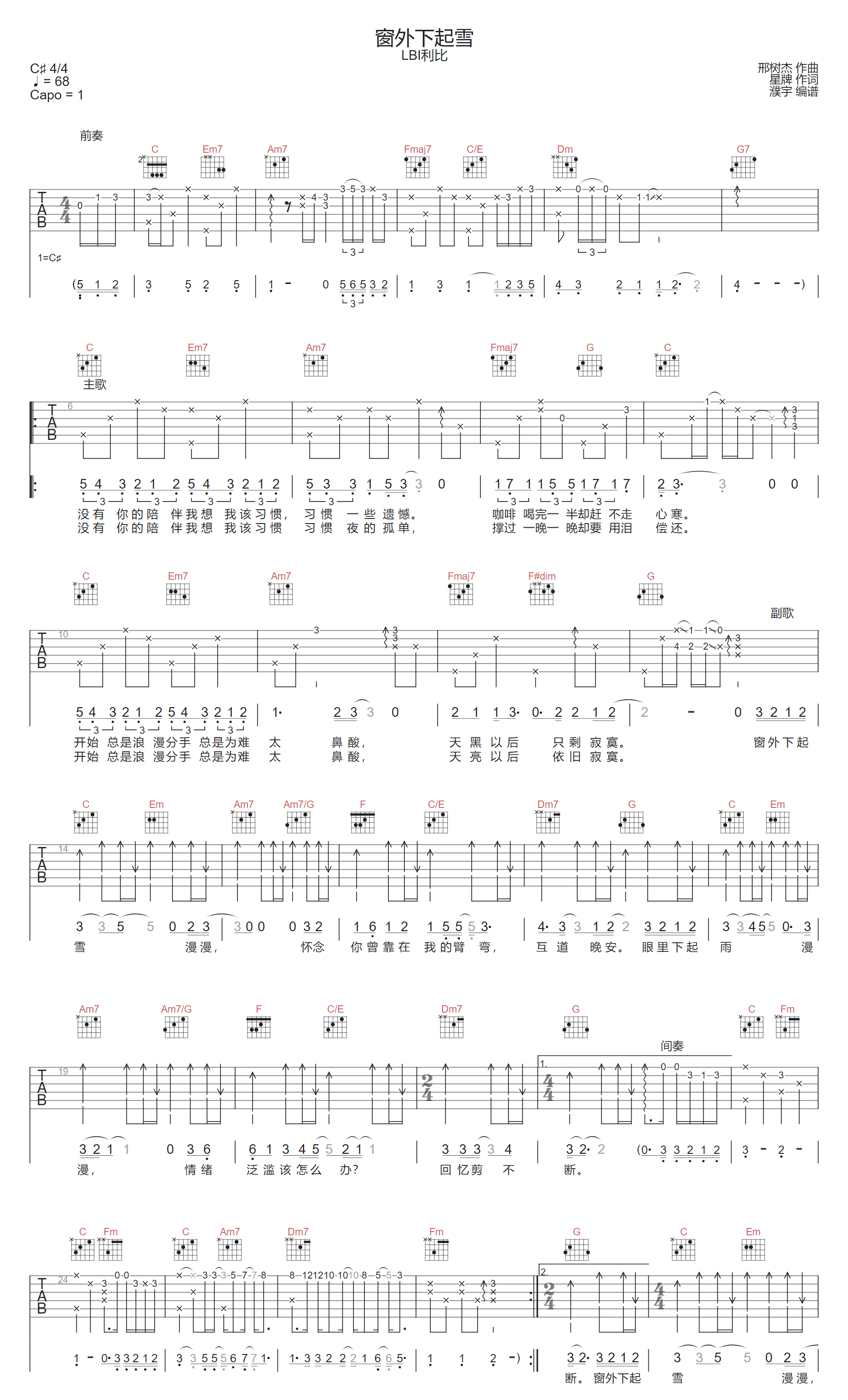 窗外下起雪吉他谱_LBI利比_C调原版弹唱谱_图片六线谱