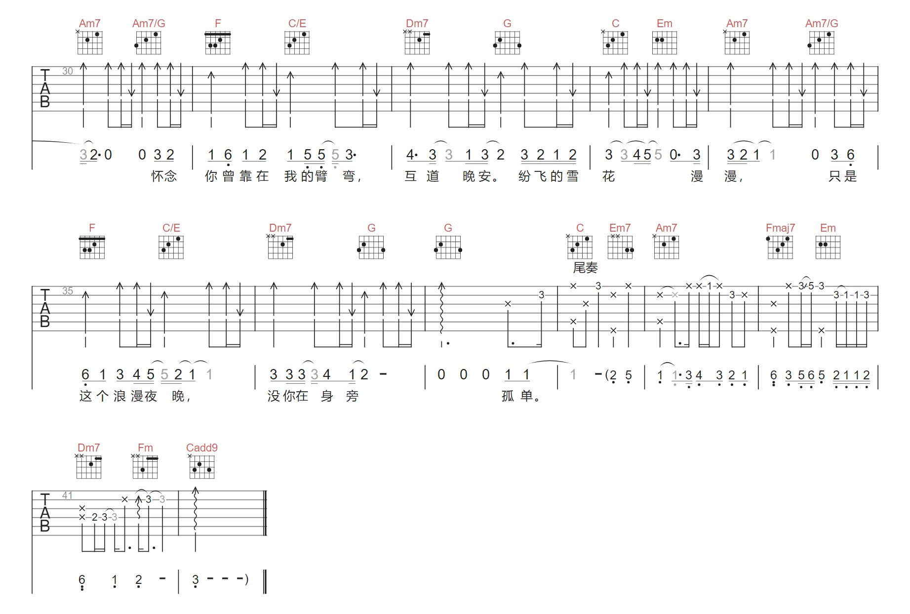 窗外下起雪吉他谱,歌曲原调为#C调,此版本的曲谱来源于@濮宇,为4/4拍的节奏,按C调指法编配,共2张高清吉他谱,变调夹1品为原歌曲的调式,演唱时可按个人音域选择合适的变调夹位置。