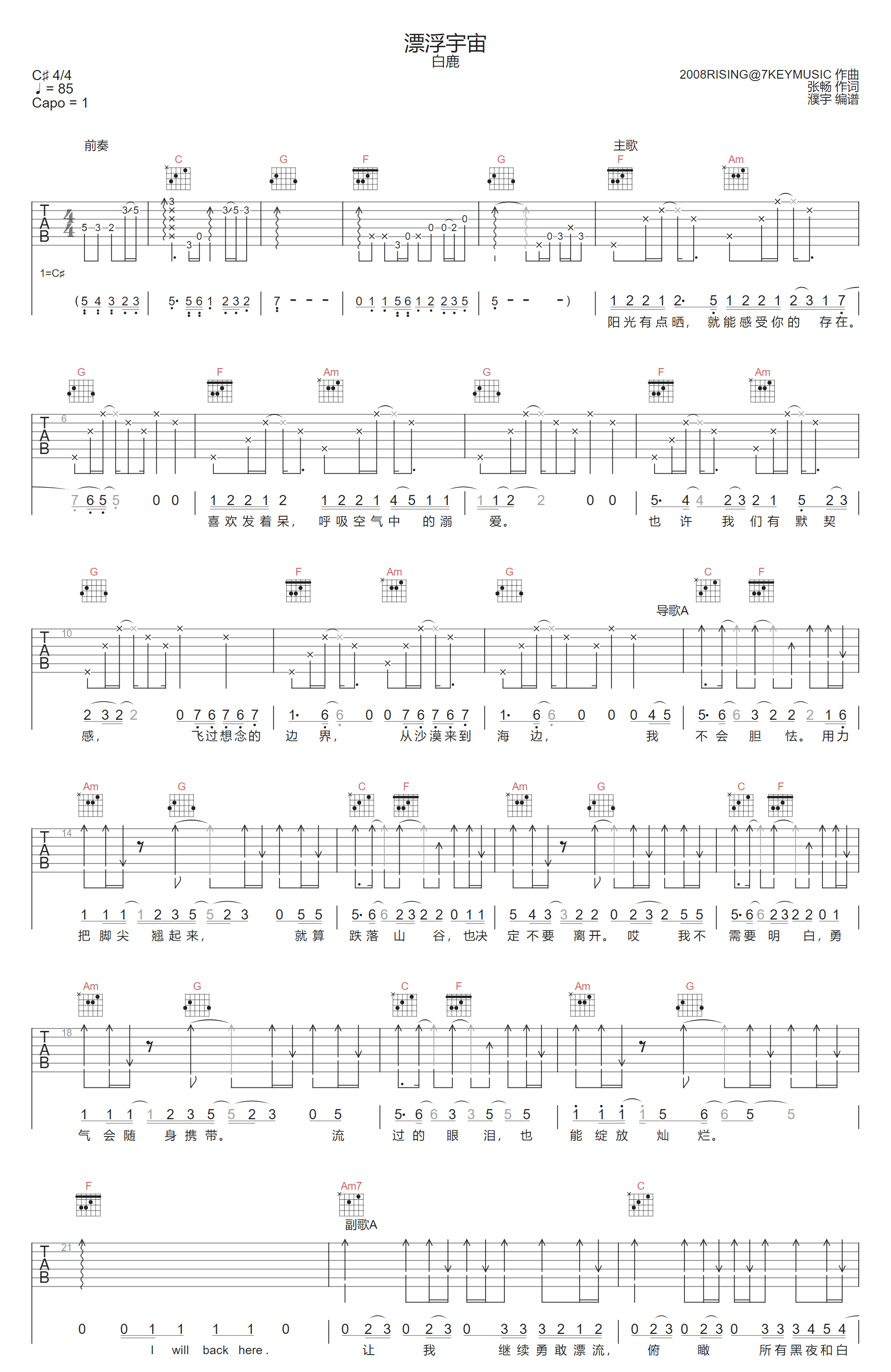 漂浮宇宙吉他谱,歌曲原调为#C调,此版本的曲谱来源于@濮宇,为4/4拍的节奏,按C调指法编配,共3张高清吉他谱,变调夹1品为原歌曲的调式,演唱时可按个人音域选择合适的变调夹位置。