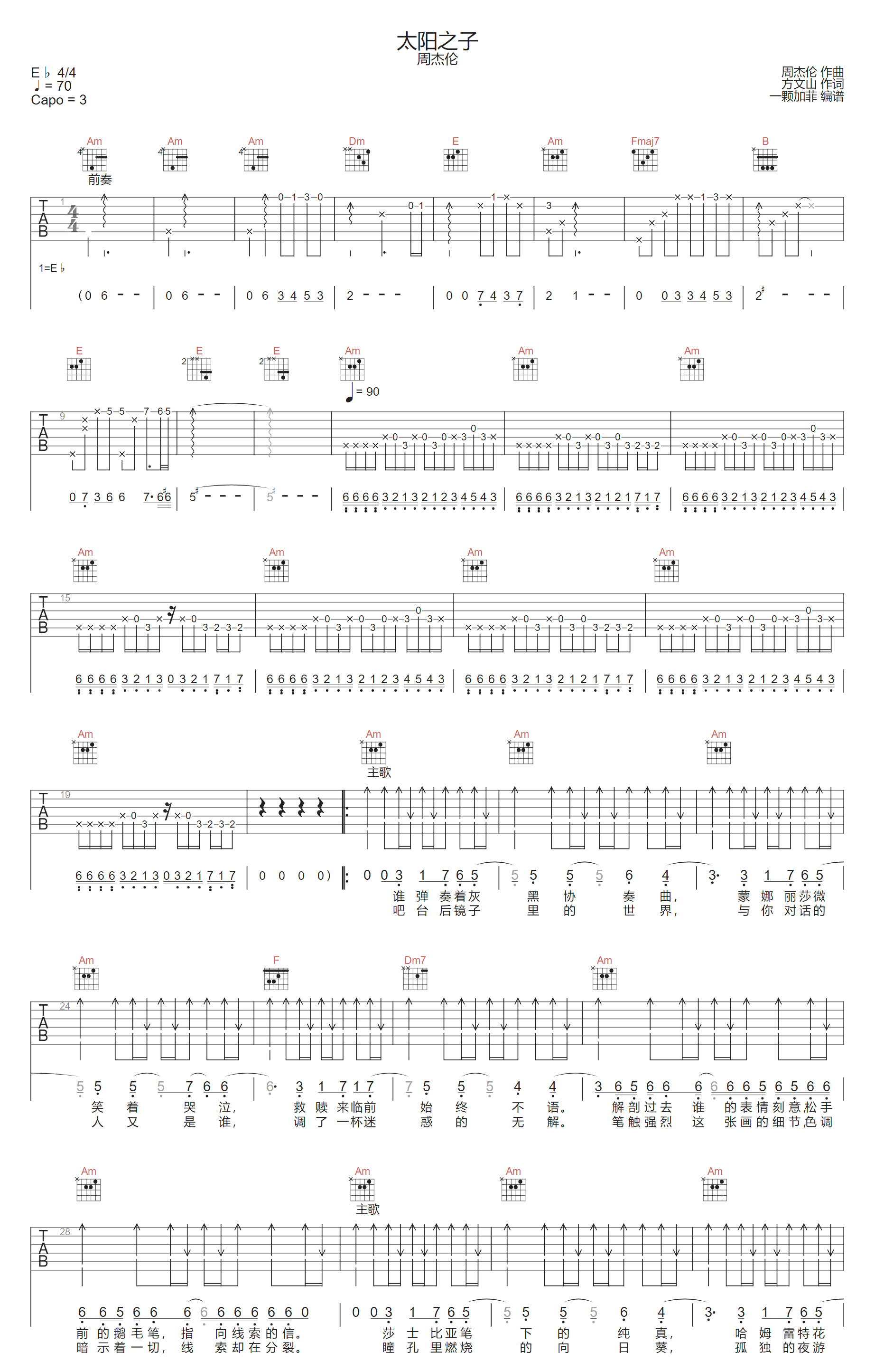 太阳之子吉他谱_周杰伦_C调原版弹唱谱_图片六线谱