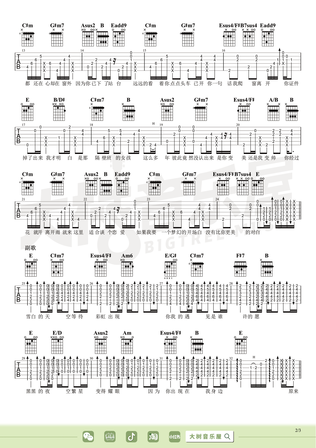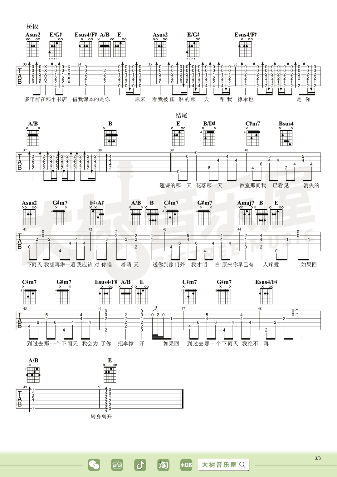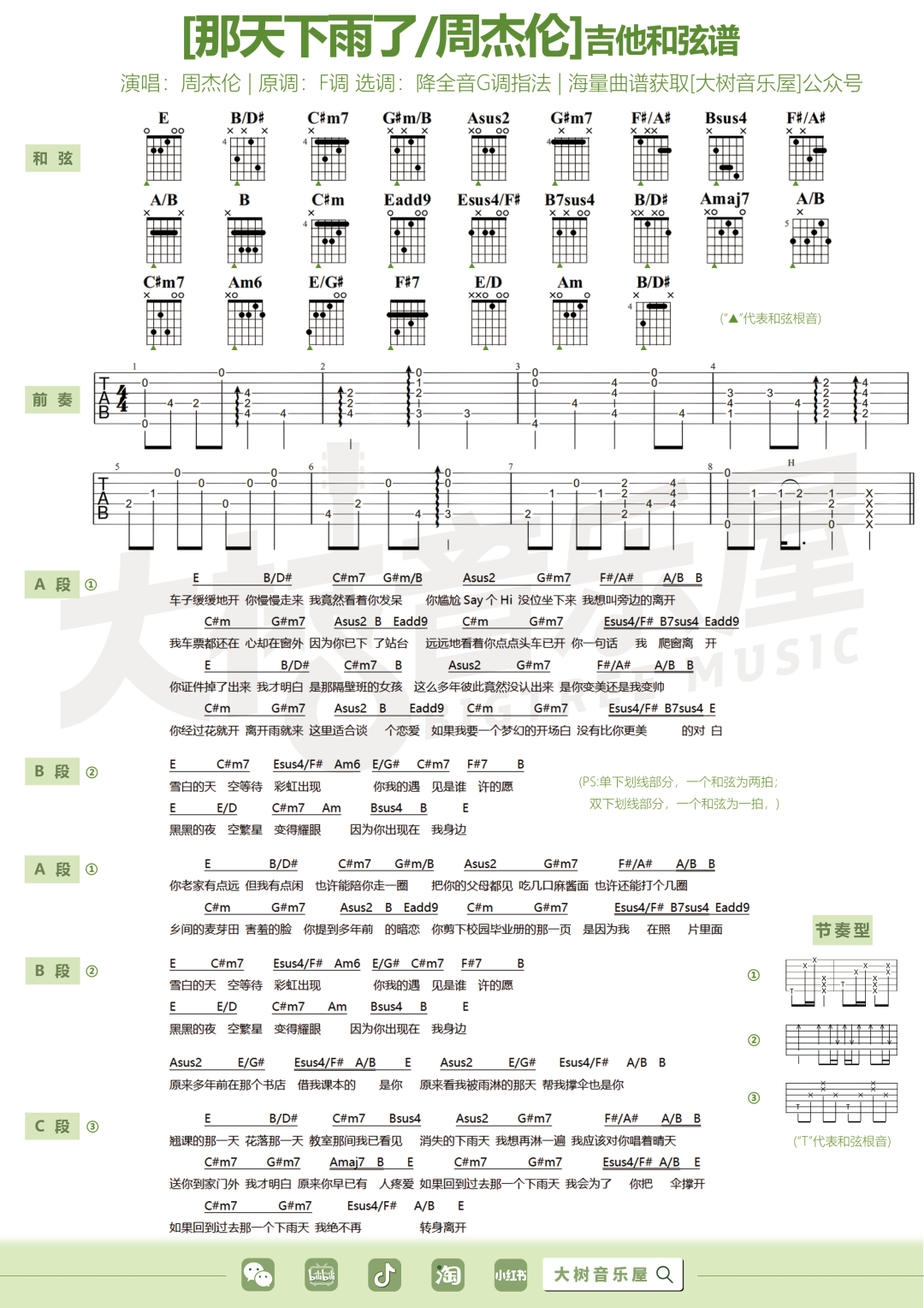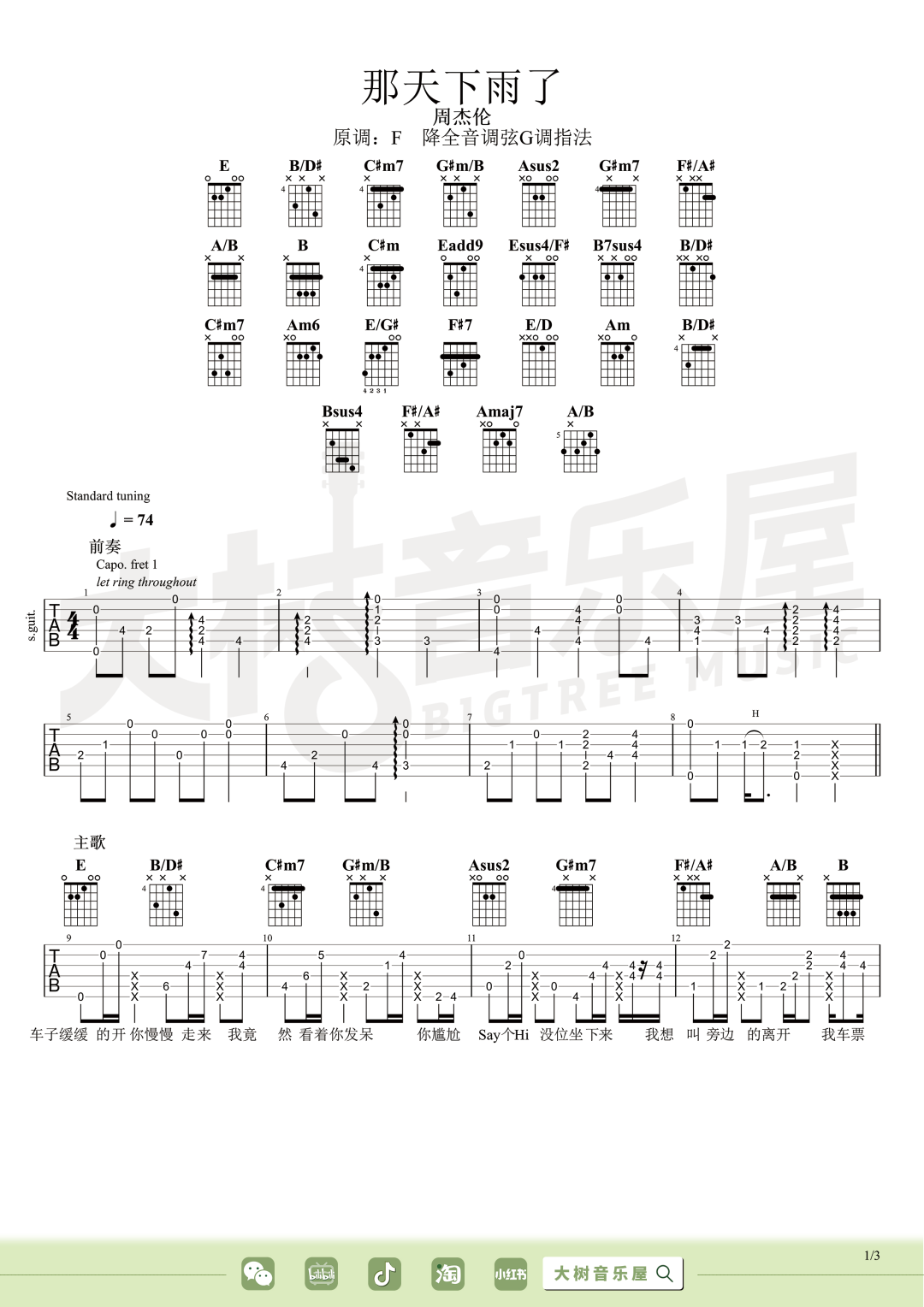 那天下雨了吉他谱,歌曲原调为F调,此版本的曲谱来源于@大树音乐屋,为4/4拍的节奏,按G调指法编配,共4张高清吉他谱,变调夹降全音调弦为原歌曲的调式,演唱时可按个人音域选择合适的变调夹位置。