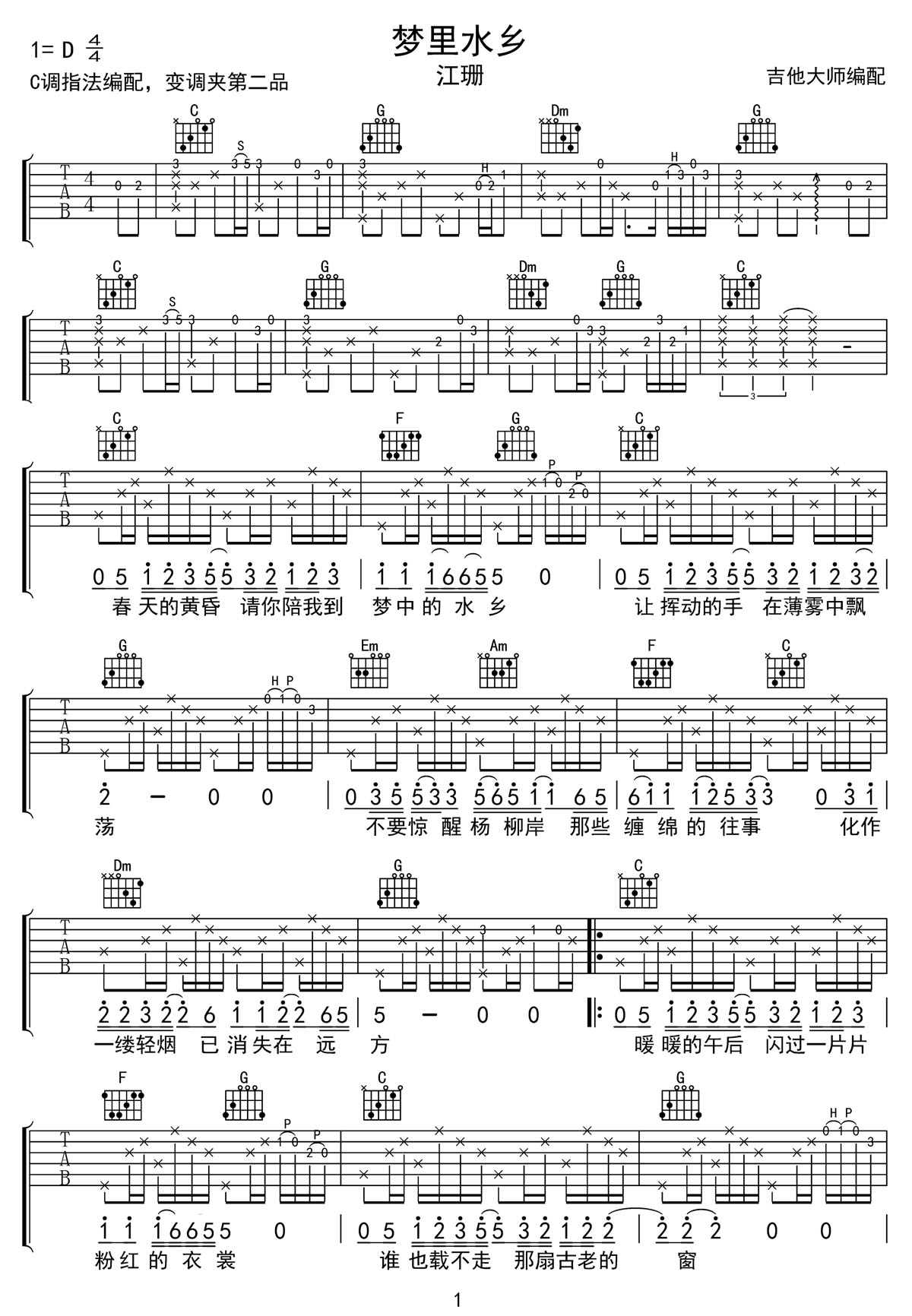 梦里水乡吉他谱,歌曲原调为D调,此版本的曲谱来源于@吉他大师,为4/4拍的节奏,按C调指法编配,共3张高清吉他谱,变调夹2品为原歌曲的调式,演唱时可按个人音域选择合适的变调夹位置。