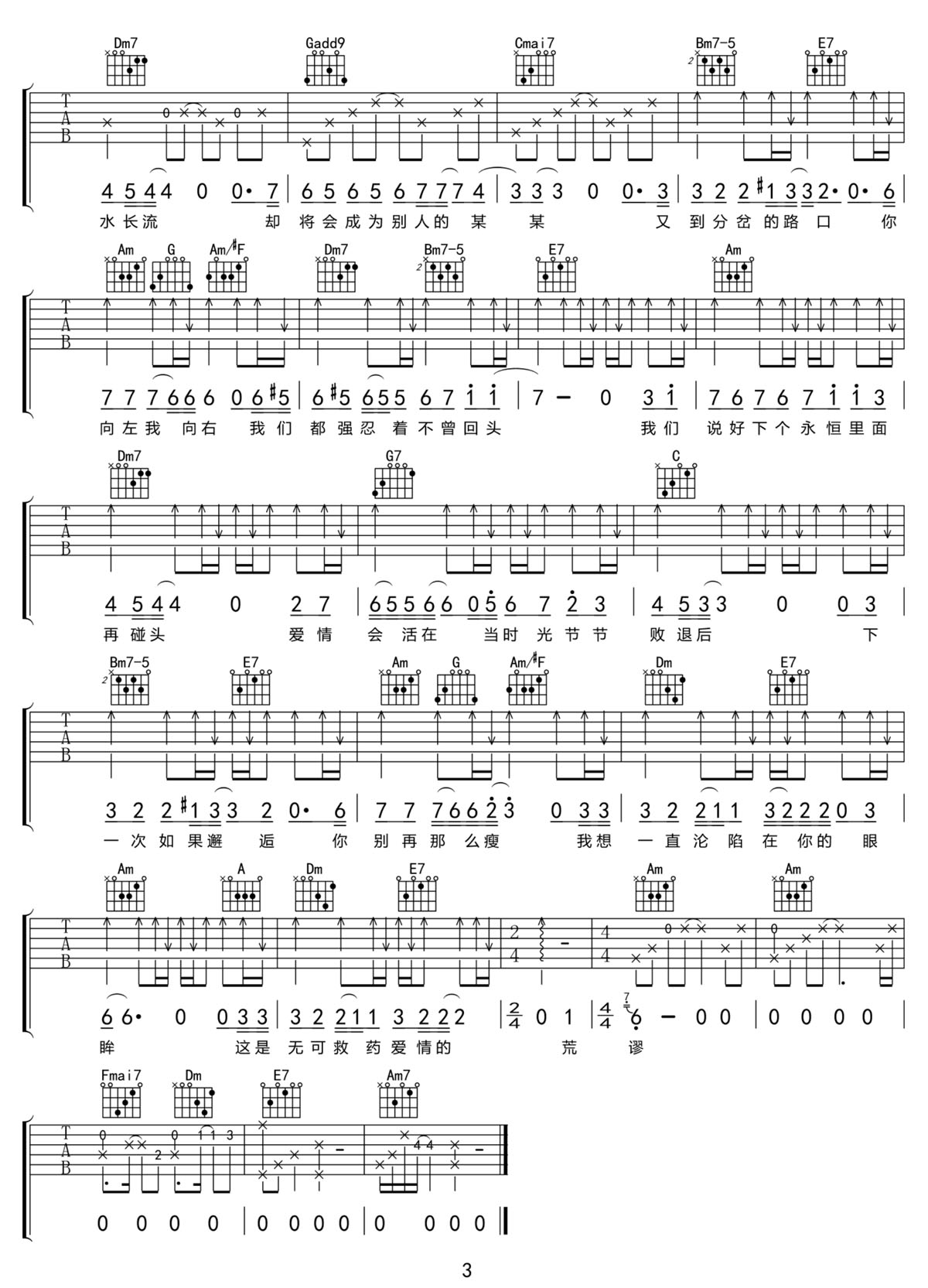 南滨路没有尽头吉他谱,歌曲原调为C调,此版本的曲谱来源于@郑好,为4/4拍的节奏,按C调指法编配,共3张高清吉他谱,变调夹不夹为原歌曲的调式,演唱时可按个人音域选择合适的变调夹位置。 -