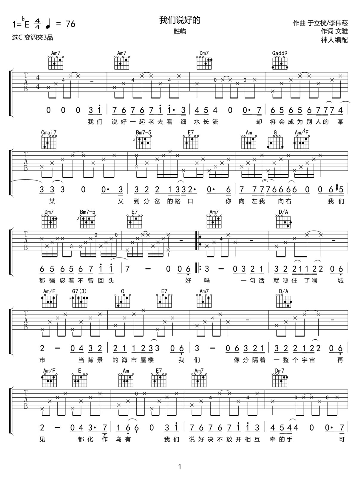 我们说好的吉他谱,歌曲原调为降E调,此版本的曲谱来源于@神人,为4/4拍的节奏,按C调指法编配,共3张高清吉他谱,变调夹3品为原歌曲的调式,演唱时可按个人音域选择合适的变调夹位置。