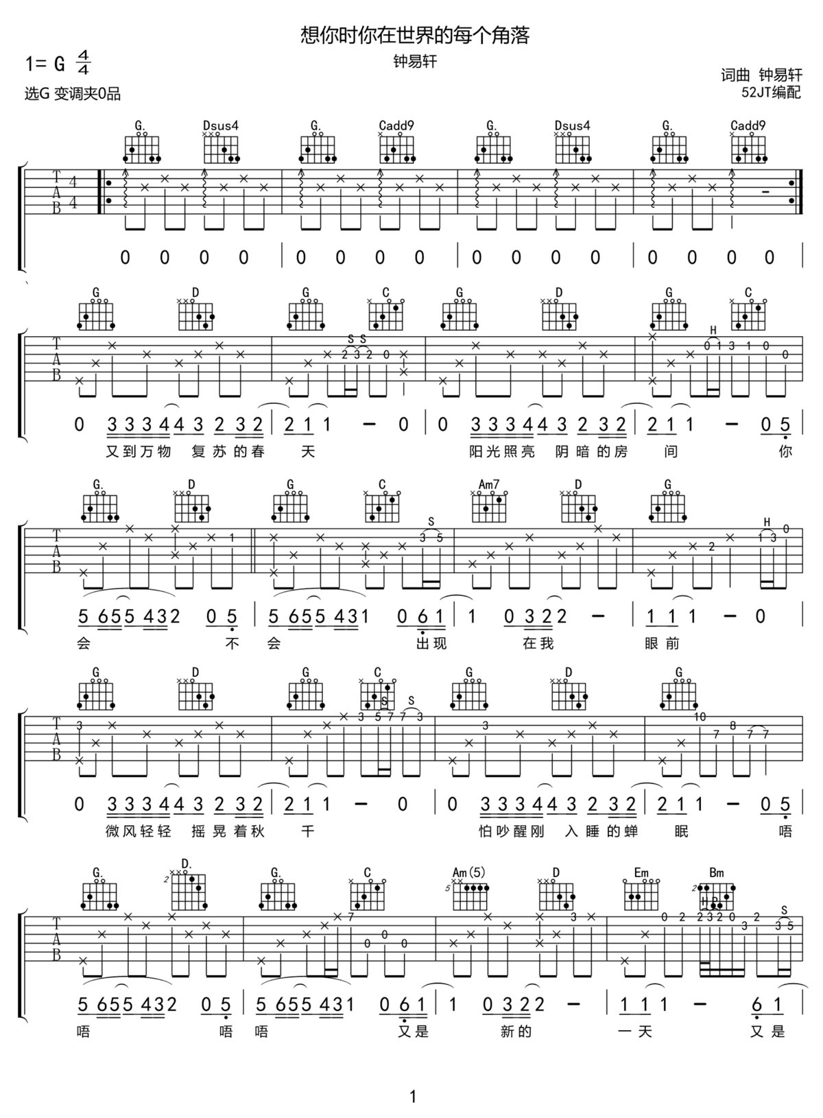 想你时你在世界的每个角落吉他谱,歌曲原调为G调,此版本的曲谱来源于@52JT,为4/4拍的节奏,按G调指法编配,共3张高清吉他谱,变调夹不夹为原歌曲的调式,演唱时可按个人音域选择合适的变调夹位置。