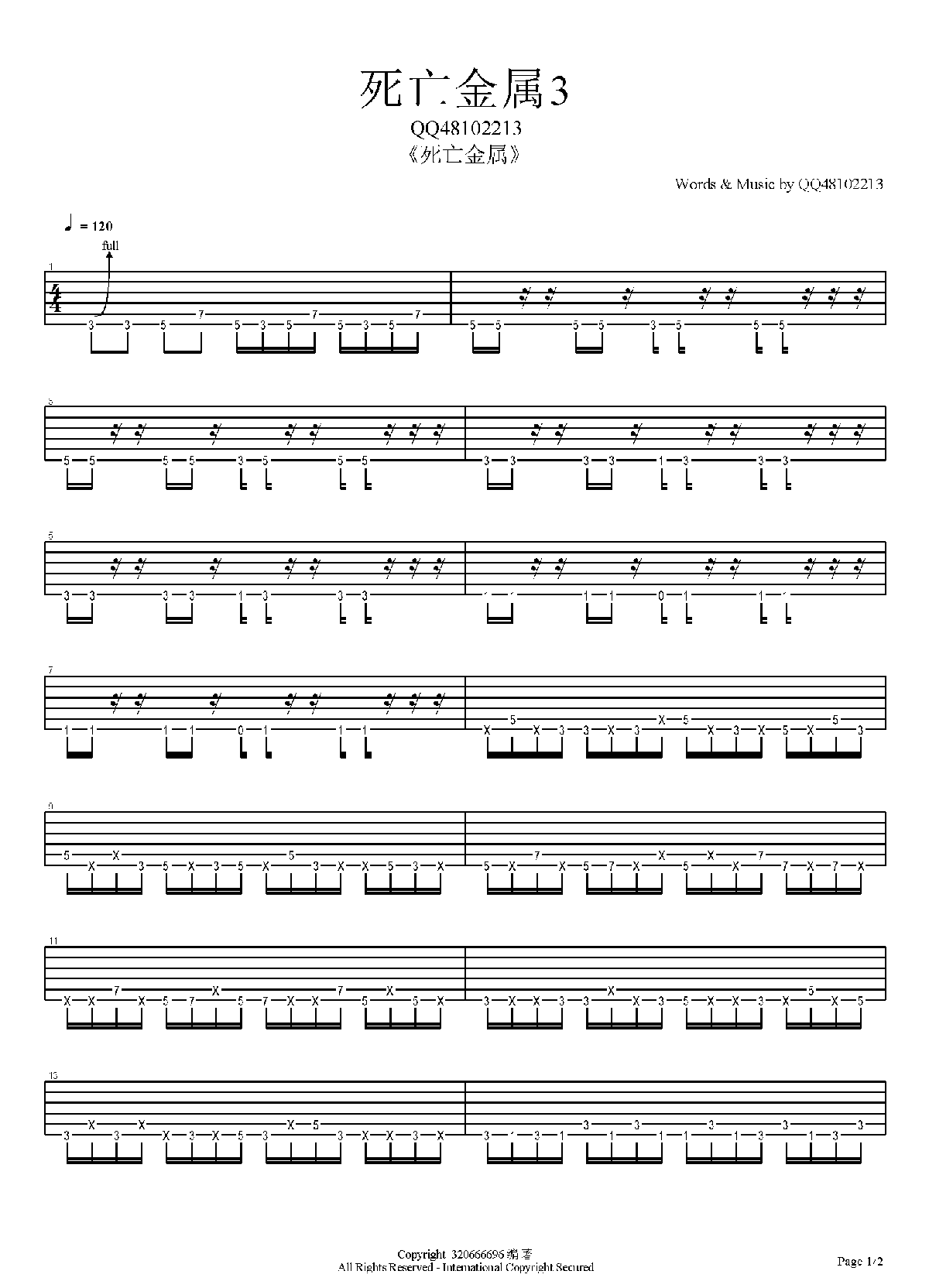 电吉他基本功练习曲谱《死亡金属2》简谱五线谱附歌词是飞鱼乐谱网于2017年04月02日 11:24:15整理更新,内容收录在电吉他乐谱栏目;飞鱼乐谱网免费分享专业、准确、规范、高清的电吉他乐谱简谱五线谱歌词等电子版资料,欢迎在线免费下载;飞鱼乐谱网无需注册会员,即可直接免费下载各类乐器学习相关资源。