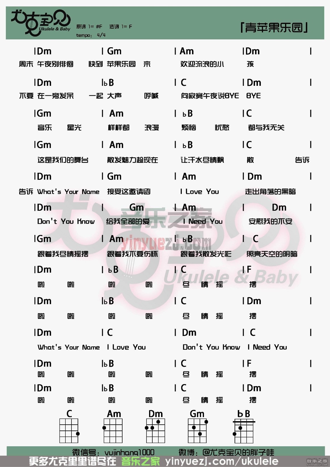 青苹果乐园尤克里里谱,小虎队演唱的一首歌曲,4/4拍的节奏,这首歌曲的原调为#F调,这里曲谱采用了F调指法进行编配,演唱时夹变调夹1品可回到原调,也可根据个人实际嗓音情况选择。曲谱由飞鱼曲谱更新上传,共1张高清图片弹唱尤克里里谱例,来源于@尤克宝贝编配出品。