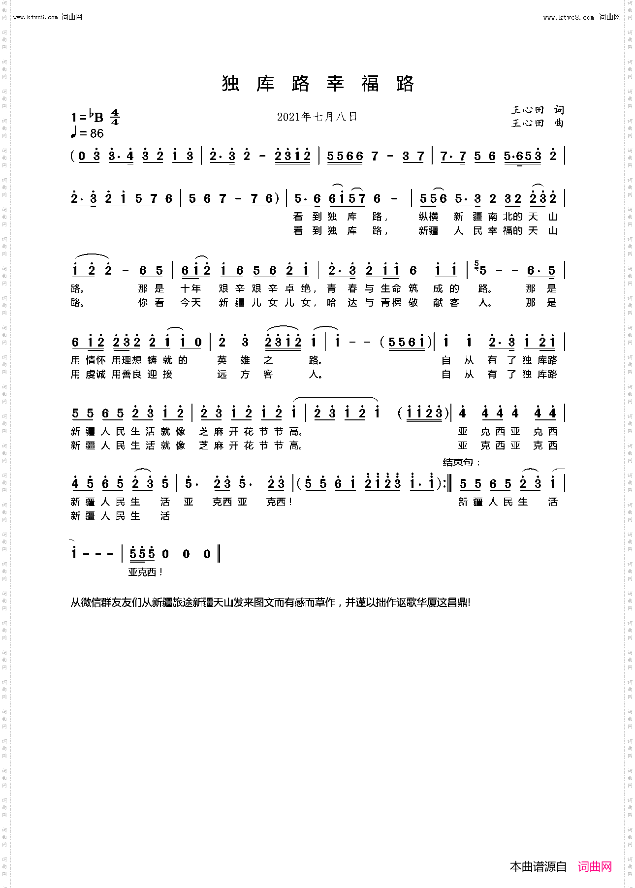 独库路_英雄路简谱_王心田曲谱_吉他谱_钢琴谱_简谱